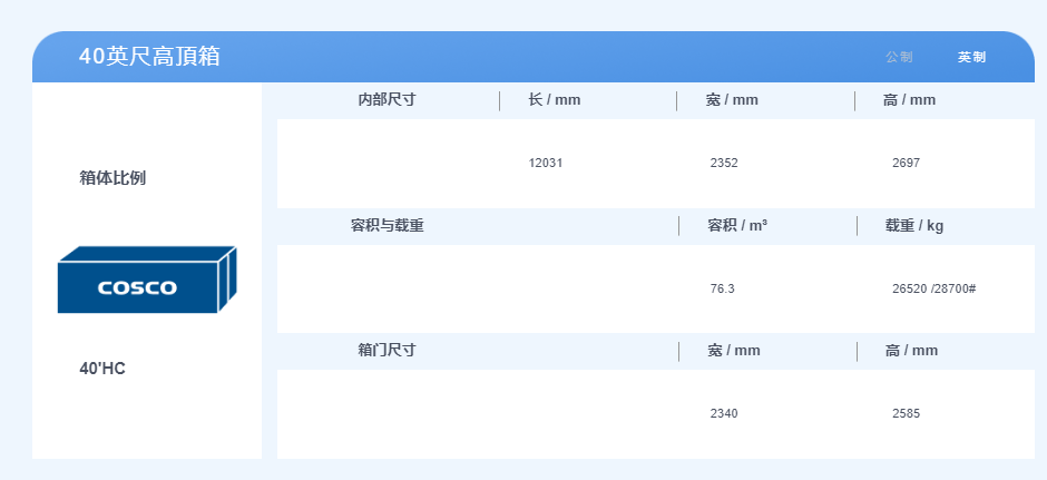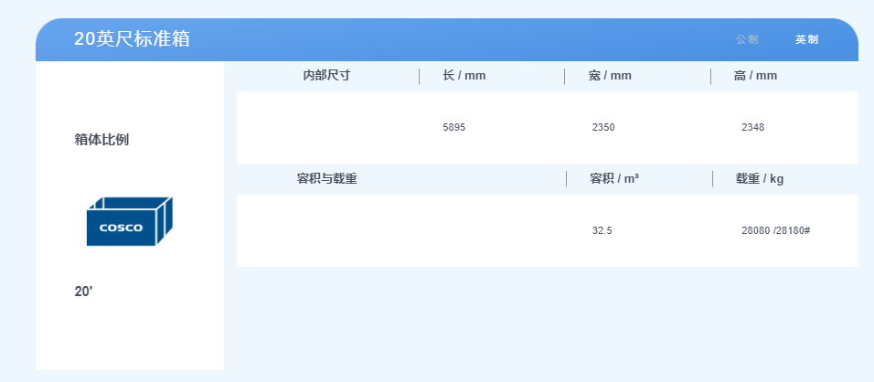 特別備注:最大貨物載重可能會根據每個國家的交通道路法而有所不同,當實際運輸貨物時,需查看貨運運輸涉及地區的交通道路法。單位換算進制數字會有細小的差別,實際操作中同規類型標準集裝箱的尺寸差別不大。