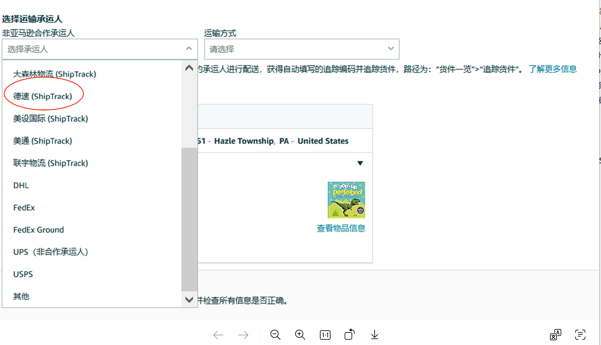 賣家在亞馬遜賣家平臺創建貨件時,選擇框中會出現可以選擇ShipTrack承運商的提示。ShipTrack承運商會顯示在“選擇運輸承運人”的下拉列表里,選擇德速(ShipTrack)”作為承運商。